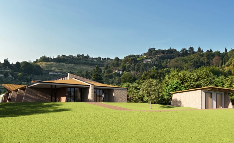 l progetto prevede la realizzazione di un maneggio con annessi spazi agricoli in località Cà d’Argon a Cenate Sotto. L’edificio principale ospita 30 box cavalli, selleria, uffici e depositi, per una superficie coperta di circa 1.230 mq. Architettonicamente, l’intervento si distingue per un impianto razionale e volumi compatti, con coperture a falda, murature in mattoni faccia a vista e setti in pietra locale. Il progetto reinterpreta in chiave contemporanea elementi della tradizione rurale bergamasca, come i contrafforti in pietra, i porticati e le cromie neutre, con soluzioni formali sobrie e funzionali, capaci di integrarsi nel paesaggio agricolo circostante.