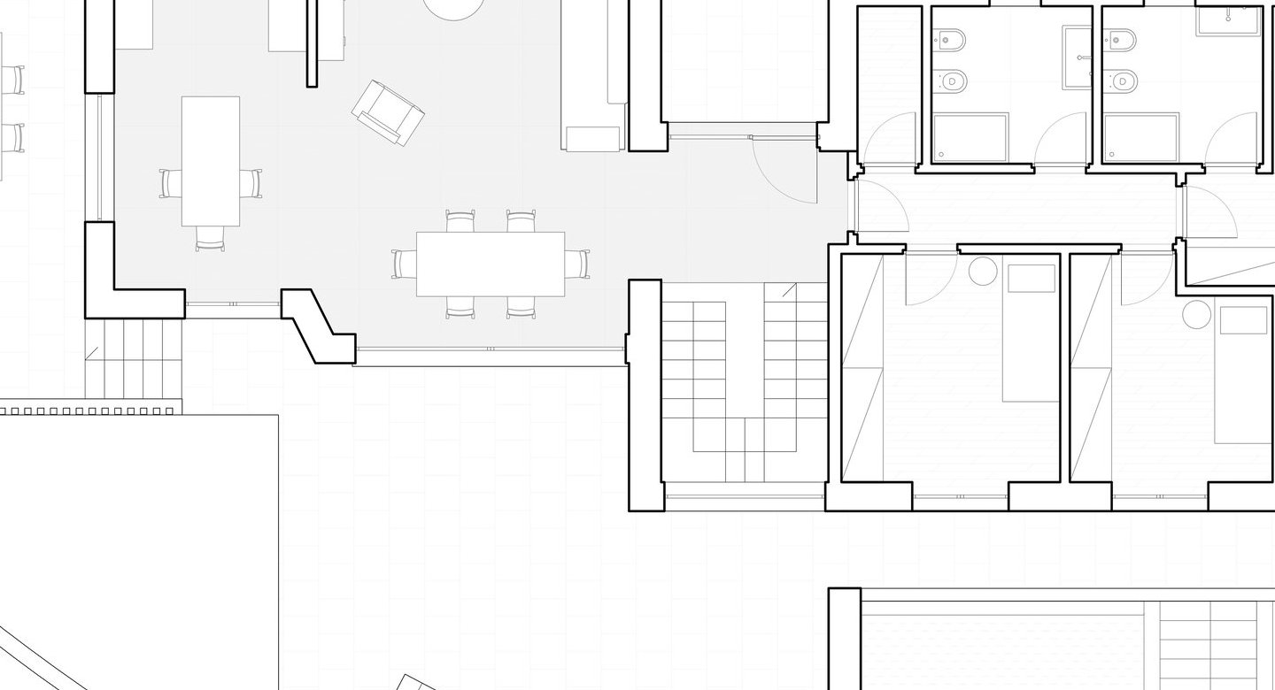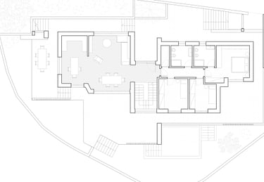 Due setti in pietra separano visivamente i volumi, rafforzando la loro articolazione. Il contrasto tra la falda inclinata e le coperture orizzontali crea un dinamismo volumetrico in sintonia con il contesto.